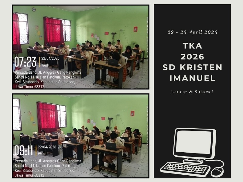 SD Kristen Imanuel telah melaksanakan Tes Kemampuan Akademik (TKA) pada hari Rabu hingga Kamis, tanggal 22–23 April 2026. Kegiatan ini berlangsung dengan tertib, lancar, dan penuh semangat dari seluruh peserta didik.